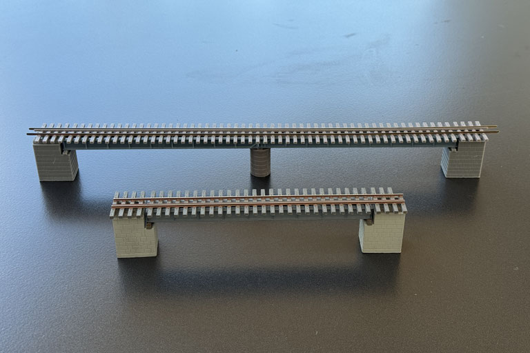 alle unsere Brücken werden mit Mittelpfeilern und Widerlagern ausgeliefert. (Widerlager meist mit Gleitlagern,Schwellenauflage und Schwellen